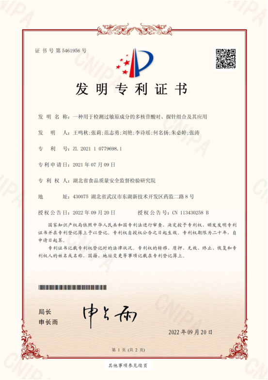 近日,依托国家市场监督管理总局科技计划项目支持,省食检院申请的发明专利“一种用于检测过敏原成分的多核苷酸对、探针组合及其应用”(专利号:ZL 2021 1 0779698.1)获国家知识产权局授权。