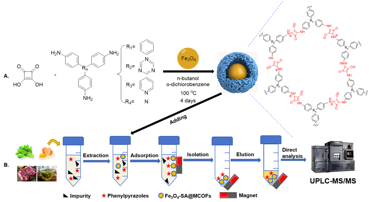 研究人员采用“一步法”成功设计并合成了一系列新型磁性方酸共价有机框架材料(Fe3O4-SA@MCOFs),用于食品中氟虫腈、氟虫腈砜、氟虫腈亚砜、氟虫腈-脱三氟甲基亚砜、乙虫腈、丁虫腈和氟甲腈等7种农药残留的富集和净化。通过改进并优化磁固相分离技术,仅需10分钟即可实现食品中苯基吡唑类农药残留的快速高通量靶向富集,极大缩短了现行检验方法繁琐的前处理步骤和时间,提高了检验检测工作效率。该方法定量限低至0.22 μg/kg,检测灵敏度较现行国家标准提高了22倍,有效解决了前处理材料选择性差、处理过程复杂、耗时长等问题,在食品安全快速检测领域展现出广阔的应用前景。