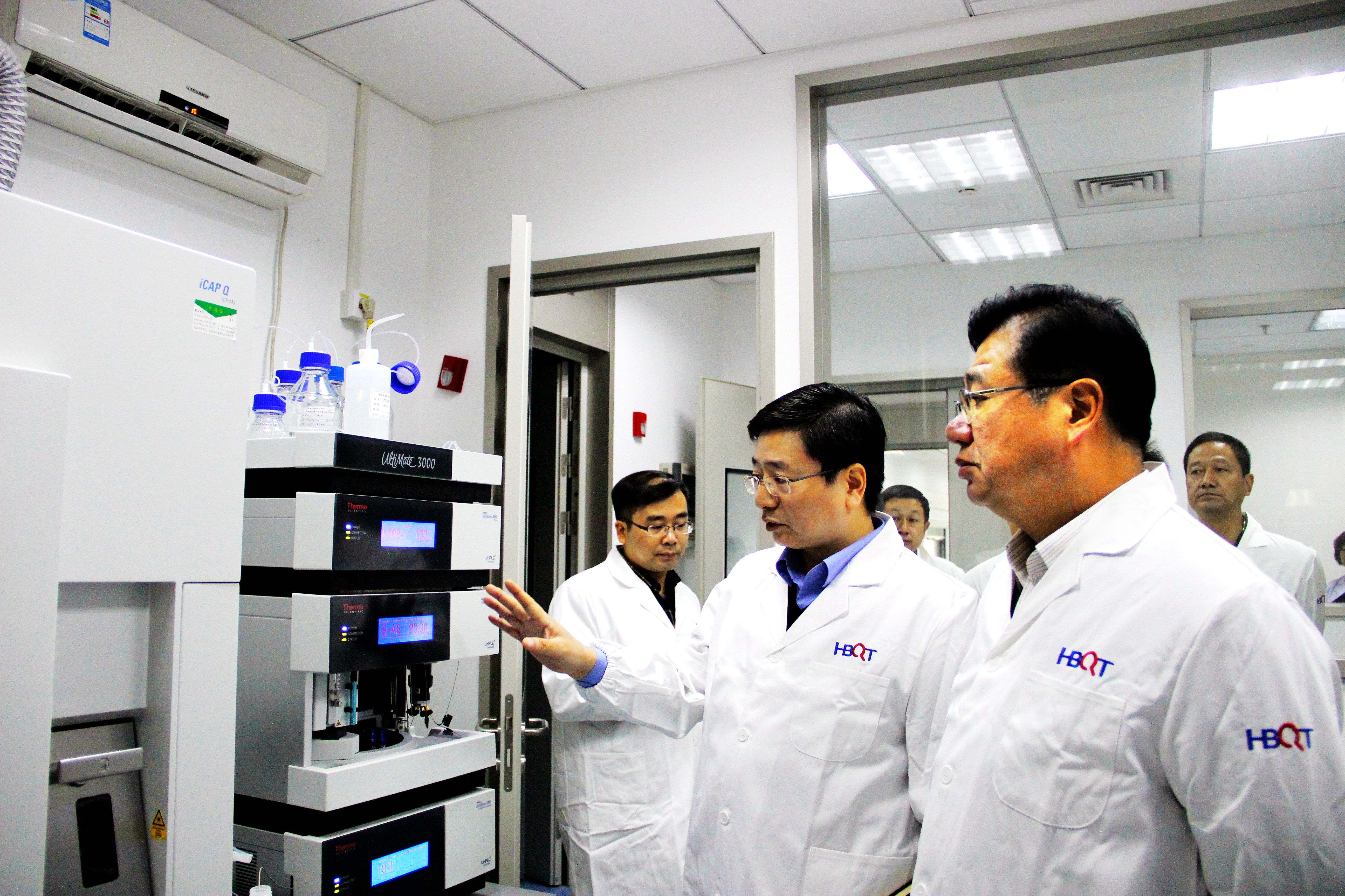 柯俊局长一行深入我院检验一线实地察看了高分辨质谱室、液相质谱室、光谱分析室、气相质谱室等重点实验室,以及核磁共振波谱仪等先进检测设备。听取了我院范志勇院长的工作汇报:包括我院整合组建情况、实验室布局、仪器设备配备和2016年主要工作等。当听到我院介绍说“目前有方法标准的食品检测项目基本都可以检,没有标准的己知非法添加物大部分可以检”时,柯俊局长对我院的建设成果,表示肯定,他仔细了解了食检院基建项目的前期进展情况,要求切实抓紧项目建设进度,争取明年一季度开工,尽早投入使用。
