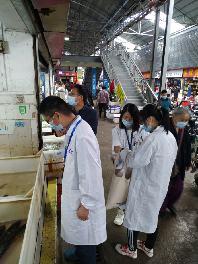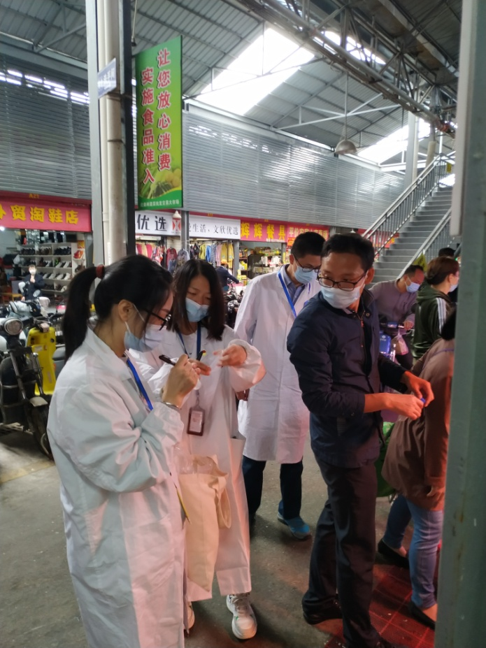 进入菜场后,万旭刚一行走到一个个摊位前查看正在销售的水果、蔬菜、肉类、鱼类等,了解菜品质量和进货来源,给前来买菜的老百姓作咨询、宣传,并与市场开办方及食品安全管理员进行沟通交流,讲解食用农产品安全监管和检验检测要求。在实地查看过程中,技术人员随机采集了生鲜蔬菜、猪肉、鲜活鱼虾及其暂养水、酱腌菜等样品,随后进行农、兽药残留和其他污染物等安全指标的快速检测。当天共完成检测192项次,所有项次均合格。