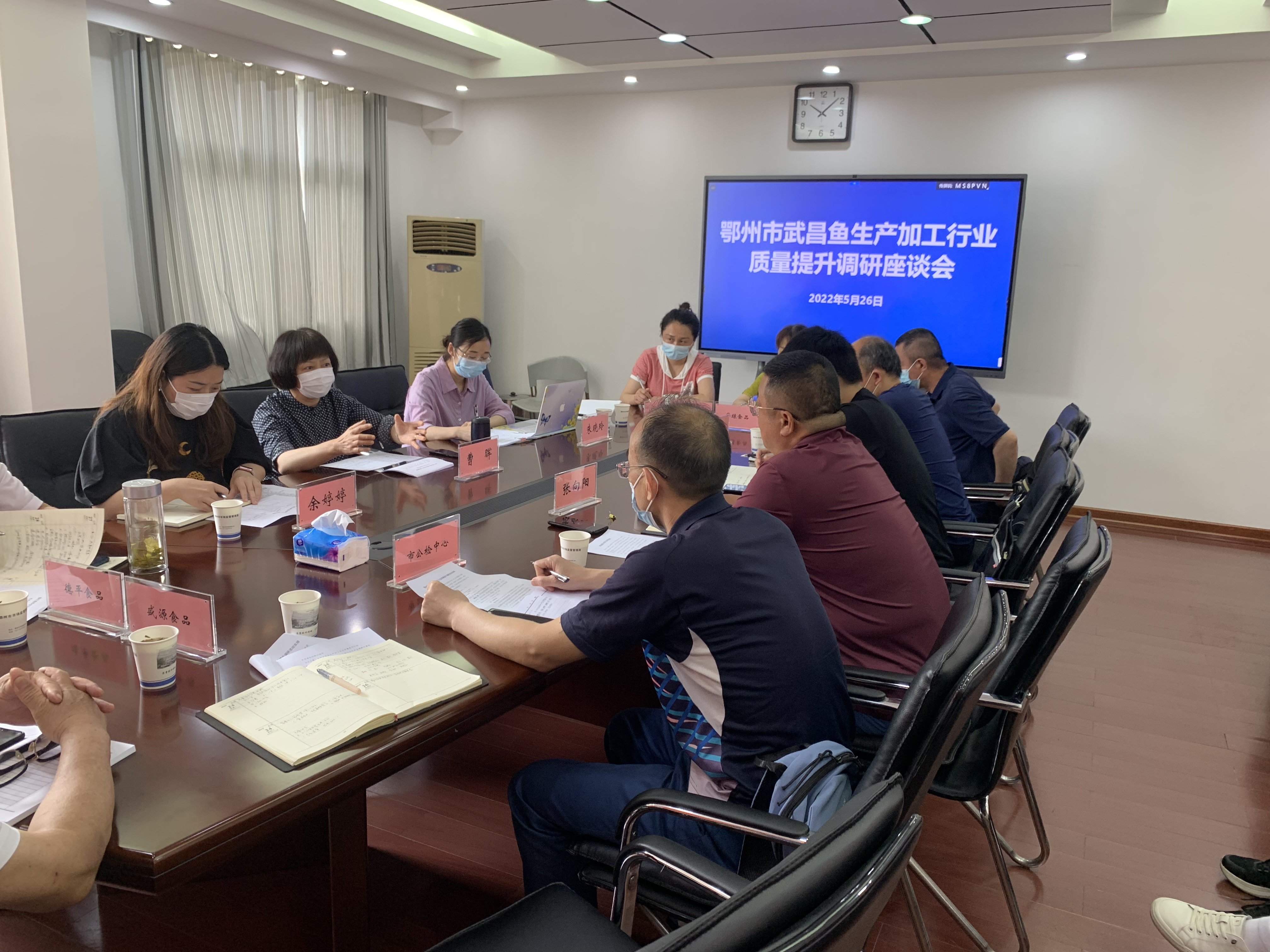 调研组介绍了此次调研的目的、意义以及针对此次质量提升活动的初步方案,同时与鄂州市场监督管理局、鄂州市农业农村局、市公检中心、省质检院鄂州分院、鄂城区、梁子湖区、临空区市场局以及武昌鱼生产加工企业人员开展座谈,座谈会上,调研组收集了行业发展存在的问题和难点。座谈后,调研人员对鄂州市武昌鱼生产加工企业开展了实地走访。
