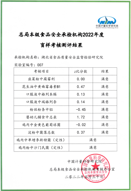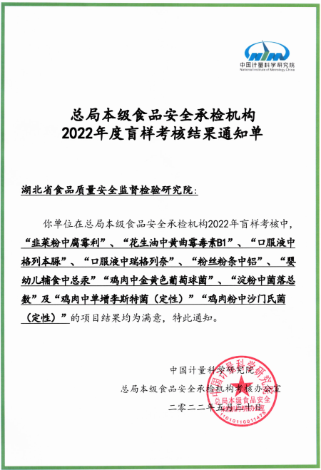 近日,湖北省食检院收到中国计量科学研究院总局本级食品安全承检机构考核办公室印发的《总局本级食品安全承检机构2022年度盲样考核结果通知单》,我院参加的“韭菜粉中腐霉利”“花生油中黄曲霉毒素B1”“口服液中格列本脲”“口服液中瑞格列奈”“粉丝粉条中铝”“婴幼儿辅食中总汞”“鸡肉中金黄色葡萄球菌”“淀粉中菌落总数”“鸡肉中单增李斯特菌(定性)”及“鸡肉粉中沙门氏菌(定性)”等10个盲样考核项目均获得满意结果。