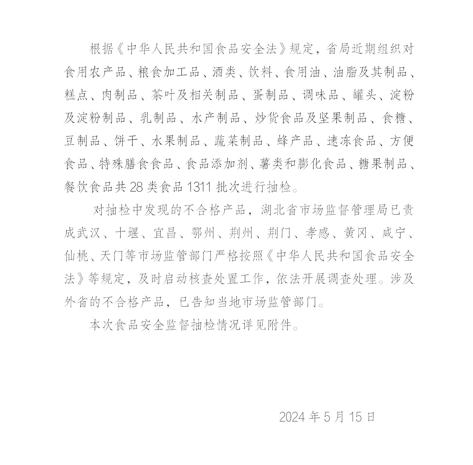 湖北省市场监督管理局 食品安全监督抽检信息公告(2024年第4期)
