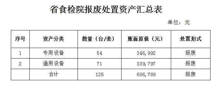 根据《湖北省行政事业单位国有资产处置管理办法》(鄂财绩规[2017]3号)和《省市场监管局关于省食品质量安全监督检验研究院资产处置的批复》(鄂市监财函[2022]211号)的文件规定,我院拟对部分已超过使用年限且无法继续正常使用的资产按程序予以报废处置,特此公示,公示期为5个工作日。
